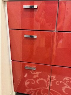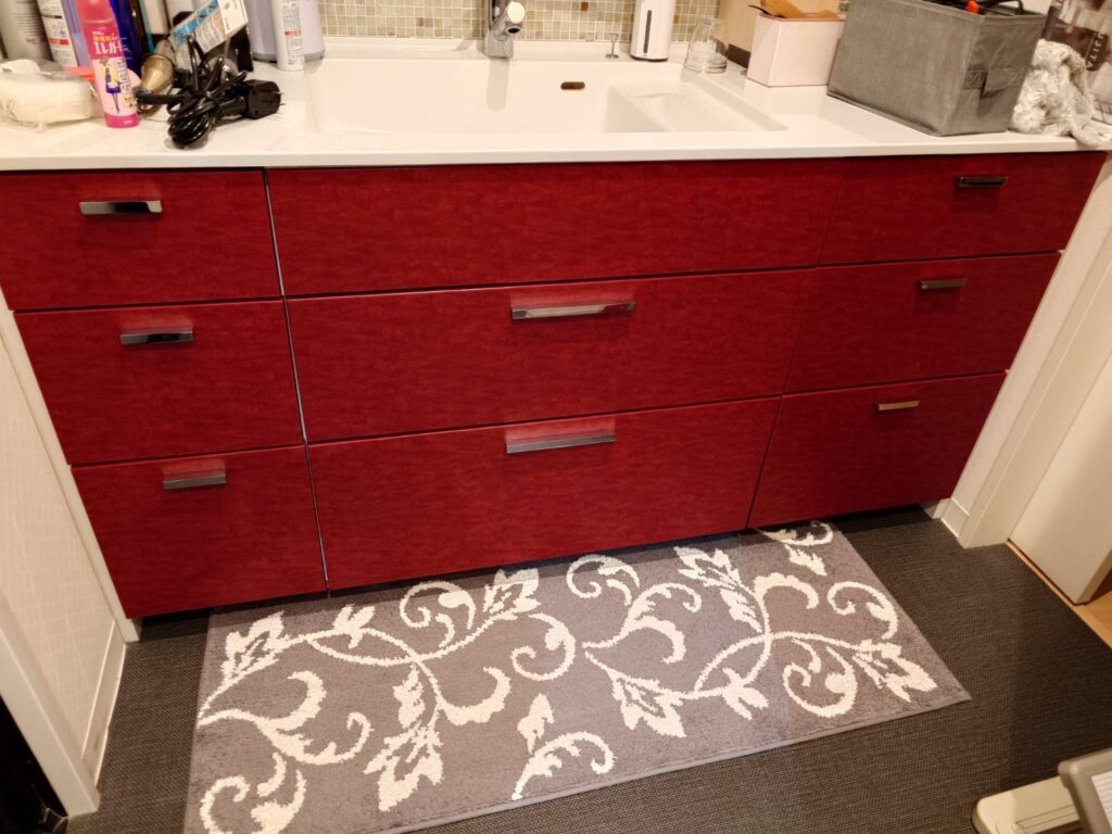 今回は洗面化粧台の引き出し面材の浮き・剥がれに対し、ダイノックシートを用いた施工を行いました。